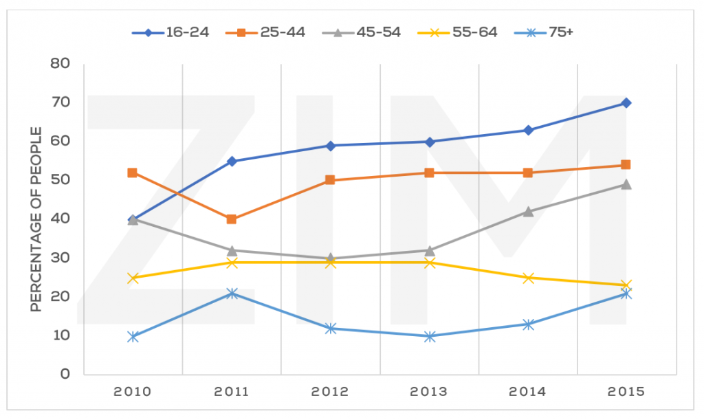 Task 1: The graph below shows the percentage of people in different age groups in one city who attended music concert between 2010 and 2015.
