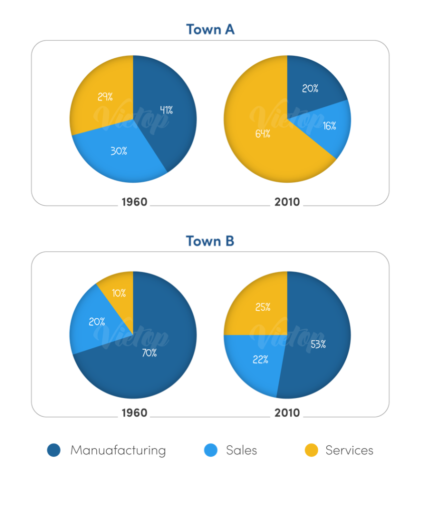 Task 1: The charts below show the percentage of people working in different sectors in town A and town B in 1960, 2010.
